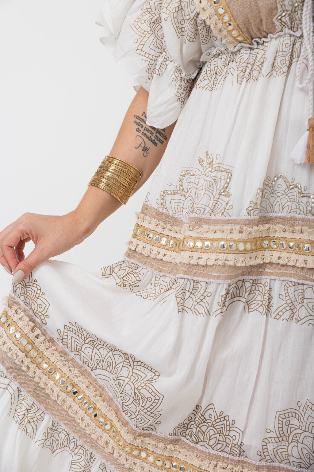 Um vestido que traduz o verdadeiro espírito boho com riqueza de detalhes e leveza. Possui bordados elaborados, estampa delicada, aplicações espelhadas e acabamentos em juta e franjas que criam um visual artesanal e sofisticado.