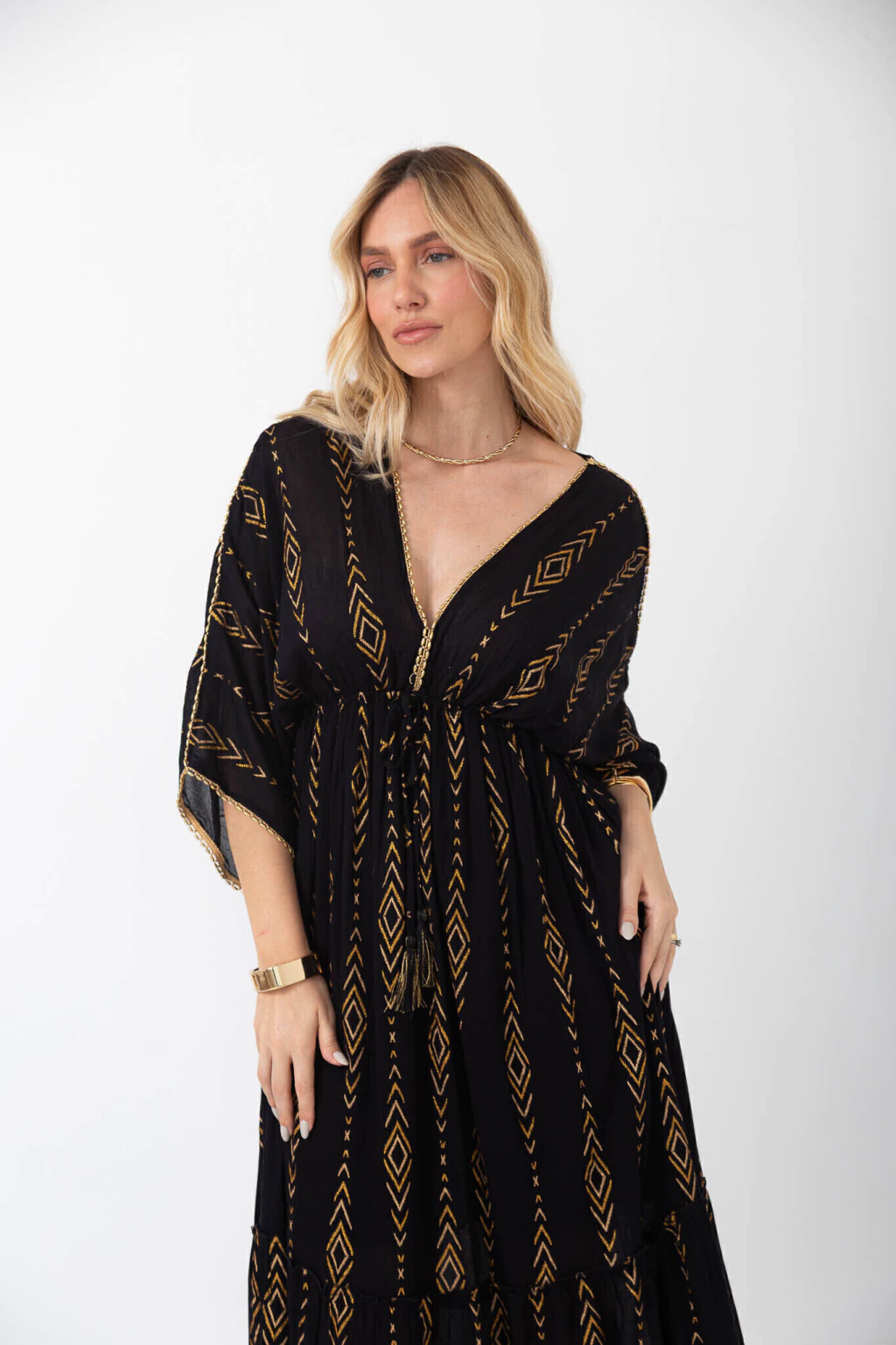 Com um ar sofisticado e artesanal, este vestido longo se destaca pela estampa geométrica em tom dourado, que cria um contraste marcante e elegante. O decote em “V” com acabamento detalhado valoriza o colo, enquanto o elástico na cintura garante conforto e caimento perfeito.